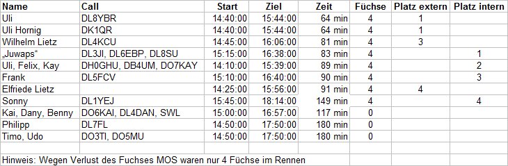 Ergebnisse der 80m-Fuchsjagd vom Sa. 04. Juni 2016